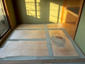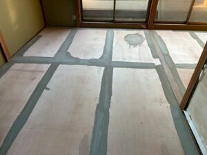 今日は朝から、CF(クッションフロア)用の下地調整をやっていきます。