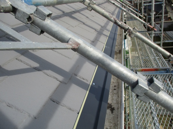 ルーフィング貼りになります。 新築等では野地板にタッカーで固定するルーフィングを使用するのですが、今回は既存屋根の 上に貼るので、遅延粘着型のルーフィング「タディス セルフ」を使用しました。