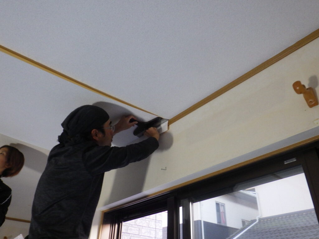 リビング天井クロス張替え中です。