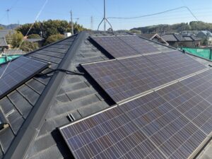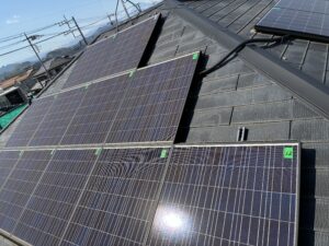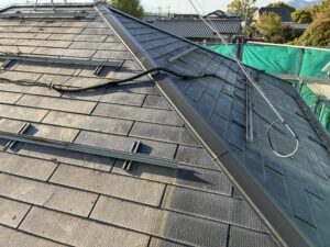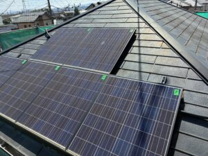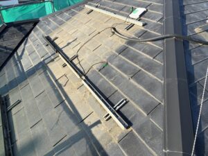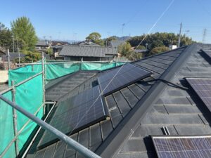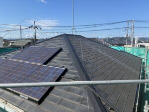 続いて、太陽光パネルの撤去作業を行いました 今回の現場では、屋根に太陽光パネルが設置されているため、 屋根カバー工法を進める前に、まず太陽光パネルの撤去作業を行っていきます。 屋根カバー工法は、既存屋根の上に新しい屋根材を施工していく工事のため、 太陽光パネルが載ったままでは作業を進めることができません。
