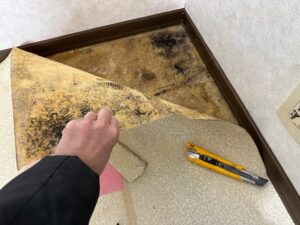 床材を剥がしてみると、下地側に汚れが回っている