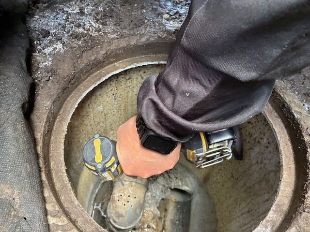 既設のトラップ桝内部に穴を開けている作業の様子です。