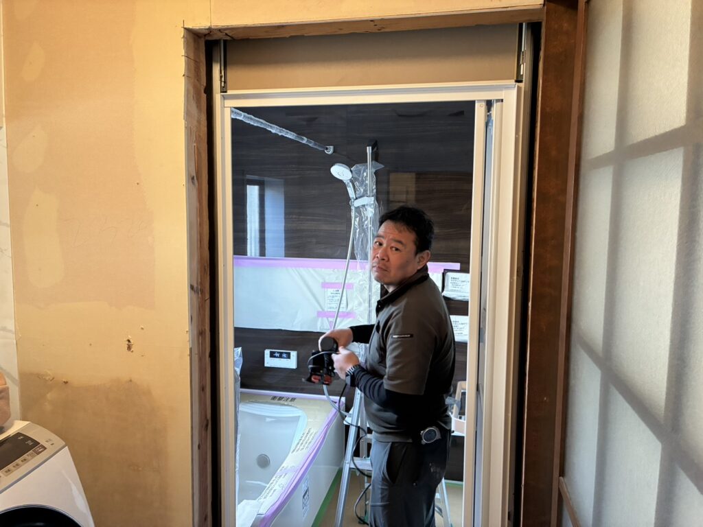5日目は、浴室開口部の下地造作、枠設置、石膏ボード張り、パテ処理まで進めることができました。