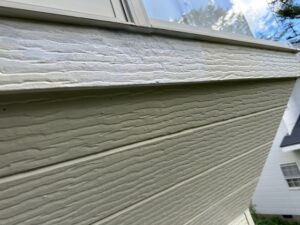 外壁補修前です。窯業系サイディングが面でたわみ、押すと沈む状態です(ブカブカ)。これは下地や留め付けの劣化サインです。