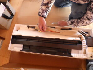 室内機を開梱し、配管(冷媒管)・ドレンホース・連絡線の取り回しを確認します。