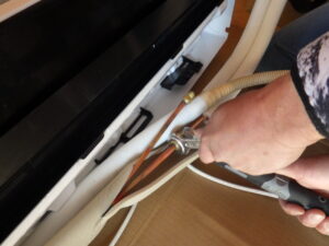 フレアナットを手締め→トルクレンチで本締めして、室内機側の配管接続を行います。