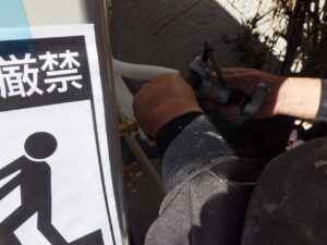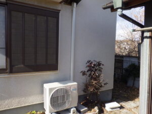 室外機の設置場所を確認します。風通し・排水・通行の邪魔にならない位置を見ながら、据付け場所を決めていきます。