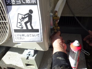 室外機側も同様にフレア接続して締付けします。配管の保温材(断熱材)もずれが出ないよう整えて、結露対策も行います。