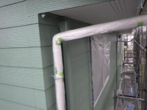 ↓ 外壁と軒天の取り合い部分の塗装中の様子になります。