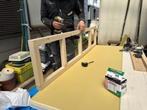 続いて、扉上部にくる垂れ壁部分の下地を 造作していきます。あらかじめ作業しやすい場所 で木材を加工し、現場の寸法に合わせて組み立て ていきました。この部分は、見た目を整えるだ けでなく、上部の納まりをきれいに仕上げるため にも必要な下地になります。スムーズに取り付け できるよう、事前に寸法を確認しながら丁寧に 組んでいきます。