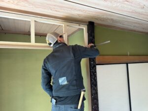 造作した下地を、クローゼット開口の上部へ取 り付けていきます。既存の柱との取り合いや 左右のバランスを見ながら固定し、全体の形を 整えていきました。この工程でクローゼットと しての輪郭が見えてきます。床の間だった空 間が、だんだんと収納スペースらしい形に変 わってきました。