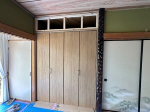 扉は見た目だけでなく、開閉がスムーズにでき るかどうかも大切になるため、建て付けを確認 しながら調整して納めていきました。扉が取り 付くと、床の間だった空間が一気にお部屋にな じみ、クローゼットとしての印象がはっきりして きます。収納として使いやすく、違和感の少な い仕上がりになるよう進めています。