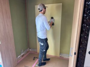 前日に床の解体から下地の組み直し、合板張り、フローリング張りまで完了しましたので、今日はクローゼット枠の取付け、 垂れ壁下地の 造作・取付け、扉の設置、クローゼット内部の石膏ボード張りとパテ処理を進めていきました。 床の間だった空間が、収納としてしっかり使える形になるよう、見た目だけでなく納まりや使い勝手も 確認しながら施工を進めていきます。