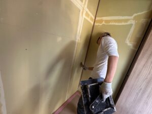 石膏ボード張り完了後は、継ぎ目やビス 頭を平らにするためにパテ処理を行っていきます。