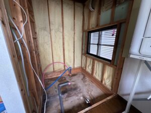 解体後の全景です。壁の下地と給排水の位置が 見える状態になりました。 この段階で新しく設置するユニットバスにあわせて 給排水をやり替えます。