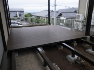 今回使用しているウッドデッキは、人工の木材であり、吸水性が低く腐りに強い為、雨風に当たるウッドデッキに適しています。