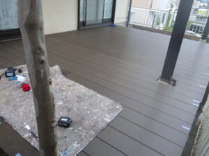 木の部分とデッキ材がぶつかってしまう為 木にぶつからないのを確認をして デッキ材の取付けが完了になります。 木の部分はノコギリなどを使用し加工 いきました。 していきます。