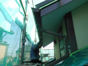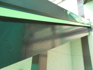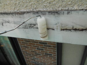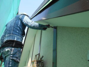続いて、破風・鼻隠し・幕板の1回目塗装に入りました。 役物部分は形状が細かく、取り合い部分も多いため、最初に刷毛でダメ込みを行い、 その後にローラーで平面部を塗装していきます。