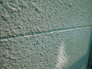 続いて、外壁のクラック補修も行いました。 亀裂が見えている箇所は、そのまま表面だけを塗装しても再発しやすいため、まずは サンダーを使用してVカットを行います。