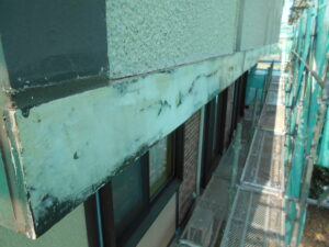 こちらは、幕板補修の2回目パテが完了したところになります。 幕板の表面には、膨れや割れ、不陸が見られていたため、下地を整えるためにパテ処理を 行ってきました。