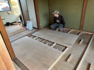 和室(畳)〜キッチン側まで床を一度リセットして、下地から組み直し→合板で床を作り直す工程です。