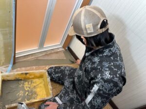 ユニットバスの組立です。床、浴槽、壁パネル、天井の順に組み立てます。
