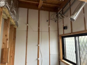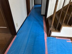 まずは養生から。解体したユニットを運ぶので通路はすべて養生をします。