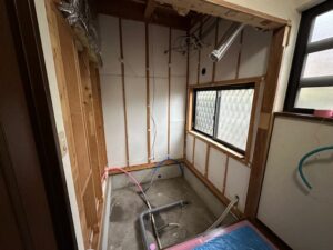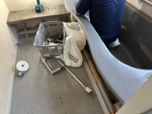 床パンを外し、下のフレーム架台・支持脚を解体します。その後配管を新しく取り付けるユニットバスに合わせて切り回しを行います。