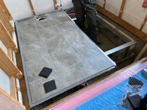 フレーム架台の設置・レベル出しを行い洗い場を据え、水平を出します。