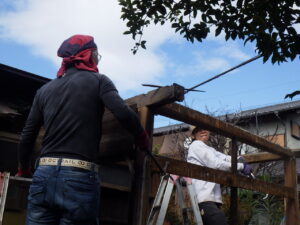 ↓ 解体しずらい垂木などは、玄翁やバールなどを使って解体していきます。