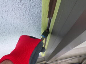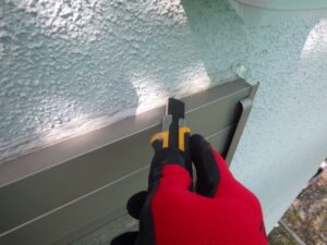 ↓ 既存コーキングの撤去を行っていきます。 カッターを使い、サッシまわりの既存コーキングに切り込みを入れながら撤去していきます。 この時に注意するのは、外壁材やサッシを傷つけないように作業することです。
