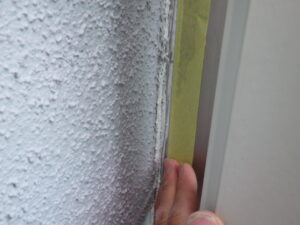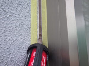 ↓ 養生を行っていきます。 既存コーキングの撤去後、コーキングを打つラインに合わせてマスキングテープで養生を行います。 養生は、コーキングをきれいに仕上げるためにとても大切な工程です。