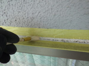 この工程を省いてしまうと、施工後にコーキングが剥がれたり、隙間ができたりする原因に なることがあります。特にサッシまわりは、外壁材とアルミサッシなど異なる部材が接して いる部分になるため、密着性を確保するためにもプライマー塗布は重要です。 塗り残しが出ないように、コーキングを打つ部分へ丁寧に塗布していきます。![]()