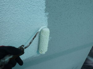 下塗りを行うことで吸い込みを整え、仕上げ塗料がムラになりにくい状態を作っていきます。 広い面はローラーを使い、塗り残しが出ないように確認しながら施工していきました。