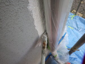 ↓ 養生と並行して、水切りの下塗りを行いました。 外壁まわりの水切り部分には、下塗りとして錆止め塗装を進めていきました。 水切りは雨水を外へ逃がすための部材で、外壁の下部などに取り付けられていることが 多い部分です。金属部はそのまま上塗りをしても密着しにくい場合があるため、下地の 状態を確認したうえで、錆止めを塗布していきます。錆止め塗装は、金属部分の防錆性を 高める目的だけでなく、上塗り塗料との密着を良くするためにも大切な工程です。