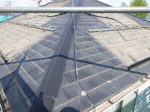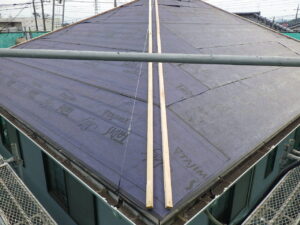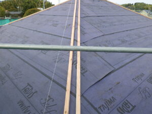 下地に密着させながら施工していく材料になります。 貼り付けの際は、シワ・たるみ・貼りズレが出ないように確認しながら、 位置を見て丁寧に貼り進めていきました。 ルーフィングは、仕上がると新しい屋根材の下に隠れて見えなくなる部分ですが、
