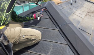 位置や納まりを確認しながら取り付けていきます。 屋根工事では、表面に見える屋根材だけでなく、