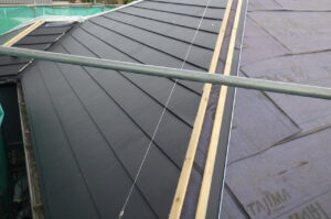 この最初の基準がずれてしまうと、その後に張る屋根材全体の通りにも影響しやすくなるため、 軒先の出幅や納まりを確認しながら慎重に施工していきました。 また、屋根材同士の重なり寸法や固定位置も確認しながら進めることで、仕上がりの見た目 だけでなく、排水性や耐久性にも配慮した施工につなげていきます。