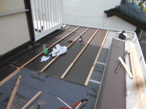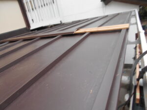 本日はその続きとして、平板金葺き・合羽の取付・棟木の取付を進めていきます。 今回の施工箇所は、ベランダ横の屋根部分です。