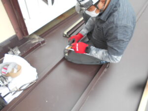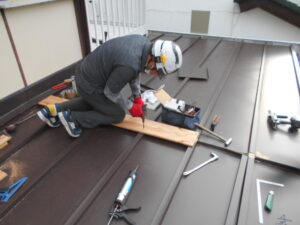 本日は、平板金を葺いていく作業から始めました。 平板金は、屋根の形状に合わせて加工しながら取り付けていきます。
