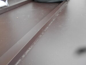 外壁側から順番に平板金を葺き進め、途中まで施工が完了しました。 板金同士の重なりや通りを確認しながら、きれいに納まるように進めていきます。