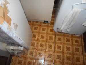 洗面脱衣所は水や湿気が溜まりやすい場所のため、長年の使用で床材や下地が傷んでくると、 踏んだときに沈むような感覚が出ることがあります。今回は実際に、床の一部が弱っており 踏むと沈みそうな箇所 が確認できたため、今後さらに傷みが進む前に補修を行うことになりました。