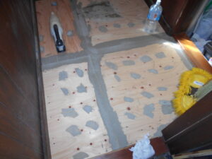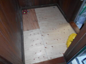 床が弱っている場合、表面だけ直しても同じ症状が出やすいため、下地を整えてから 合板で面を強くする のがポイントです。合板重ね張り中になります。 既存床の上から合板を張り、床全体の剛性(強さ)を上げていきます。