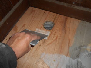 合板を張ったあとは、継ぎ目(目地)やビス頭などの段差が出やすいので、 床用パテで不陸(凸凹)調整 を行います。