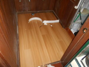 排水管が通る位置には、事前に寸法を確認してから ホールソーで開口 し、 配管に干渉しないように加工しておきます。合板の重ね張りが完了しました。ここまでで床の沈み感はかなり改善します。