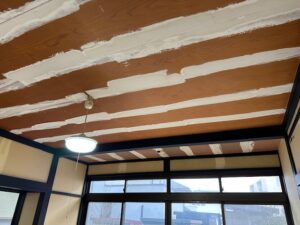 目透かし天井1回目パテ終了です。 1回目は特に、下地の癖や凹凸を見ながら 「土台をつくる」工程になります。