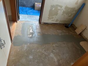 最後に、洗面脱衣所のCF仕上げに向けた 床パテ1回目を行いました。