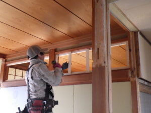 ↓必要箇所を開口し、下地の状態を確認したうえで補強を入れていきます。