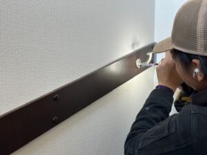 手すりを取り付ける位置に下地がないため、まず補強板を設置し、その上に手すり用の受け金具を固定していきます。