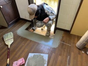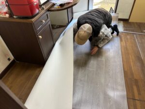 今日の施工はここで終了です。 キッチン床のクッションフロア貼りでしたが 床材は奥様にお選びいただき、キッチンパネルの色味に合うようにコーディネートされています。 ぐっと明るく上品な印象になりました。 毎日立つ場所だからこそ、足元がきれいになると気分も変わりますね。 水ハネや汚れもサッと拭き取りやすいので、日々のお手入れもしやすくなります。 明日はキッチン組み立てと浴室解体です。 忙しくなりそうな予感・・・・( ゚Д゚) お昼過ぎに奥様からおやつ頂きました!! お気遣いいただきありがとうございます。 明日も頑張っていきましょう!! 今日も1日ありがとうございました。